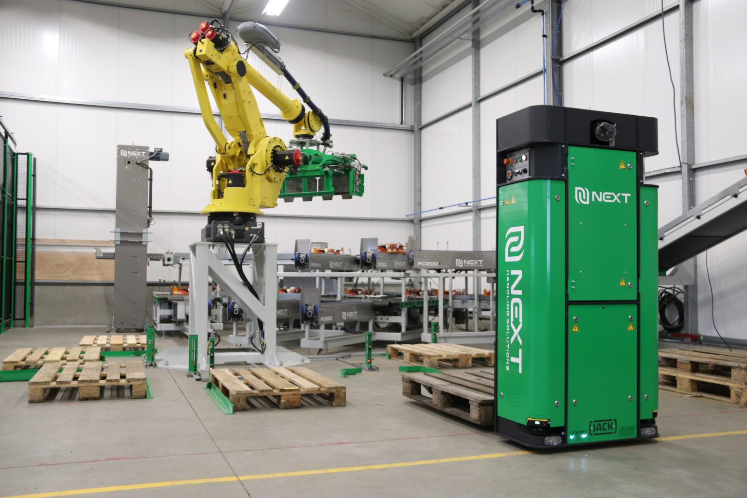 In dezelfde periode werd er een tweede loods gebouwd. De uitdaging? De ruimte zo efficiënt mogelijk benutten. NEXT dacht mee en kwam met een slimme oplossing: transportbanen door de lucht en de installatie helemaal achter in een hoek. Zo staat alles uit de loop en draait het proces precies zoals het moet.